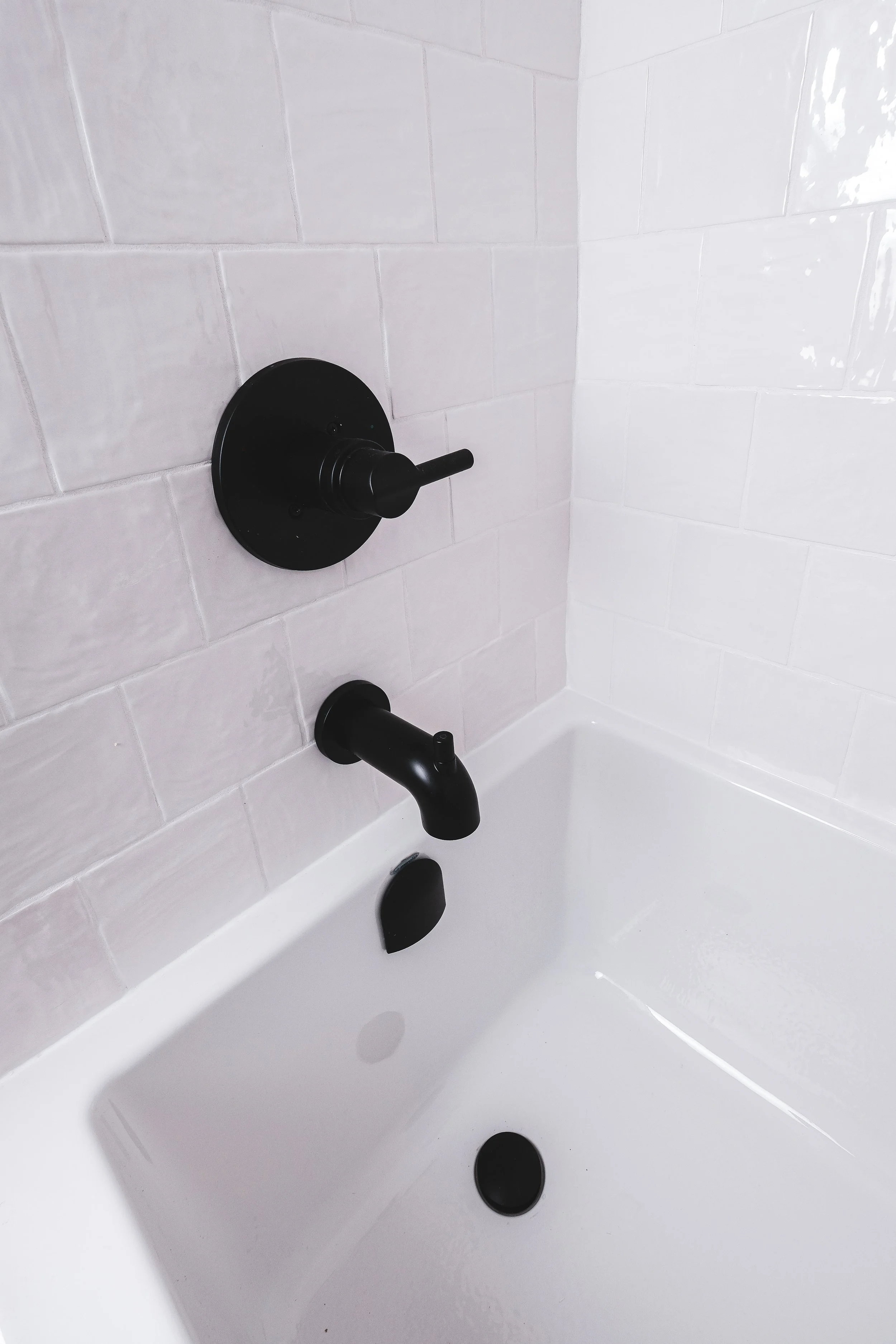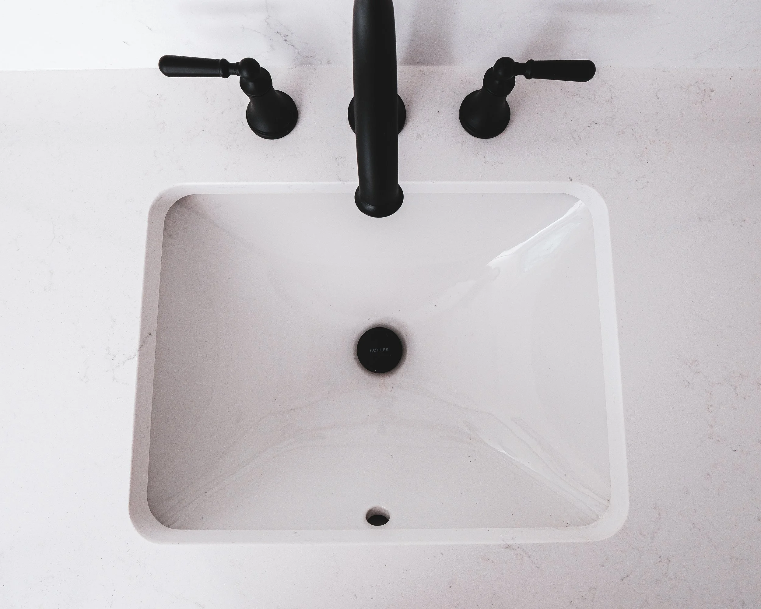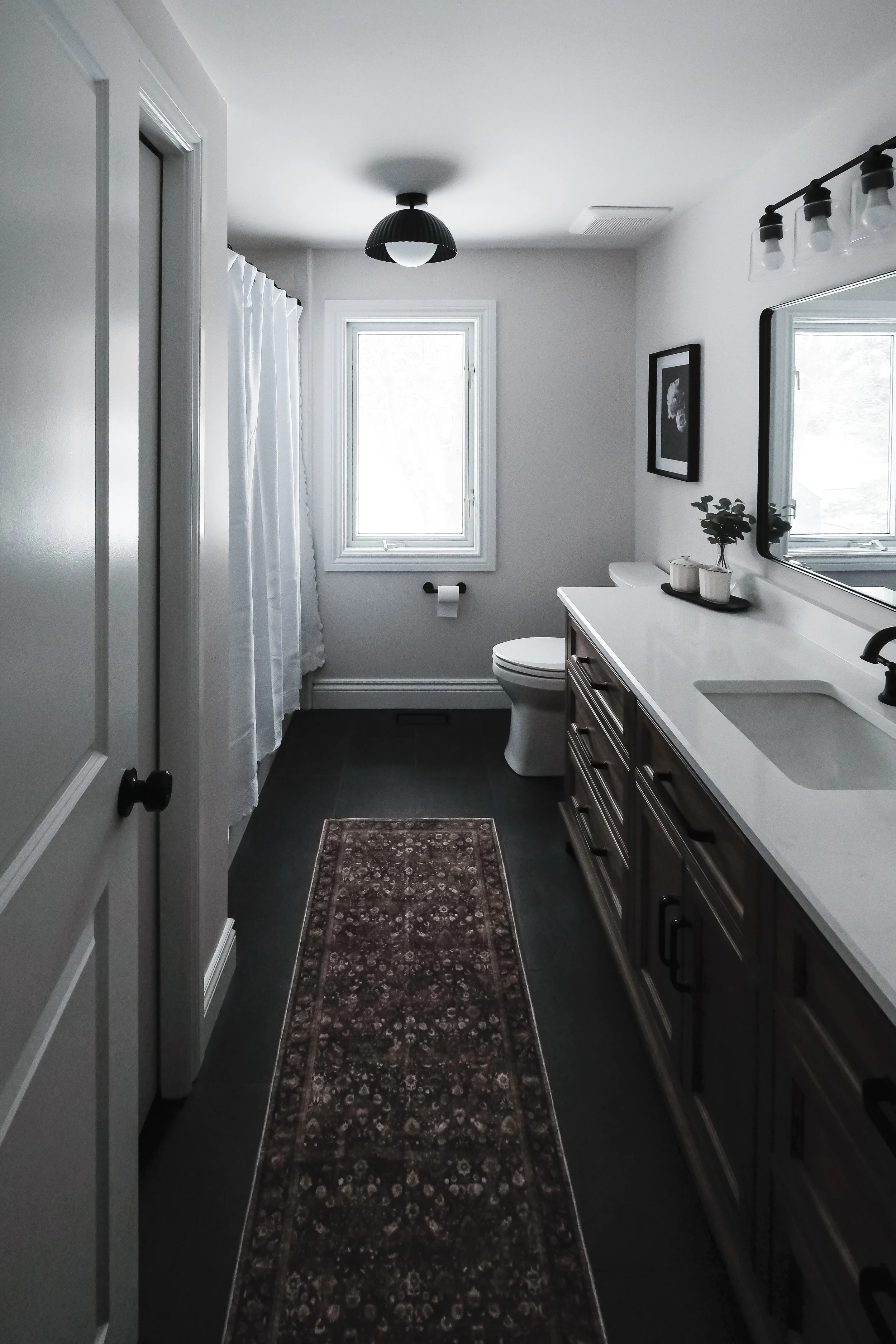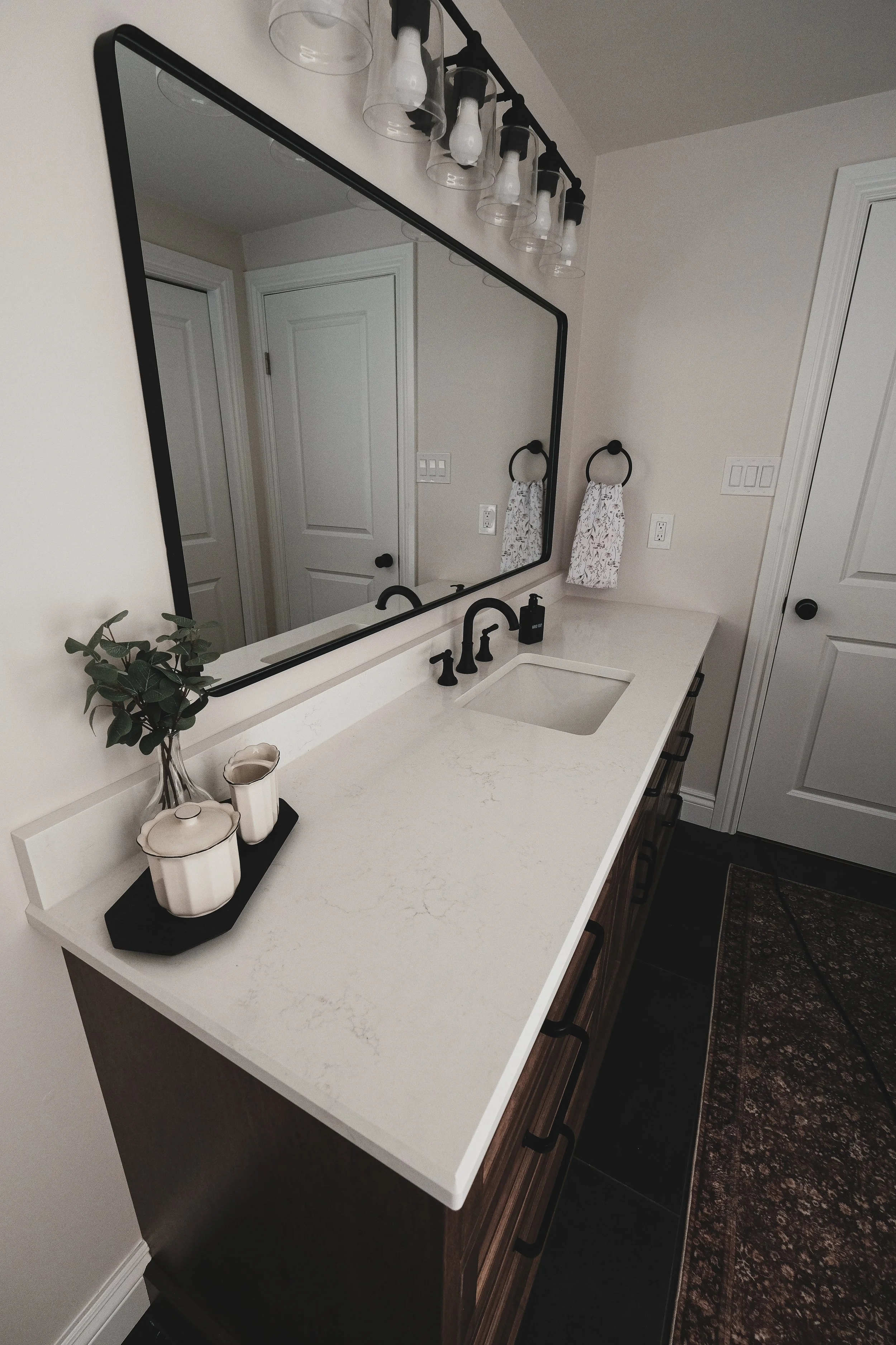 Bathroom remodel that delivers clean, modern design to balance warmth and contrast through material choices.