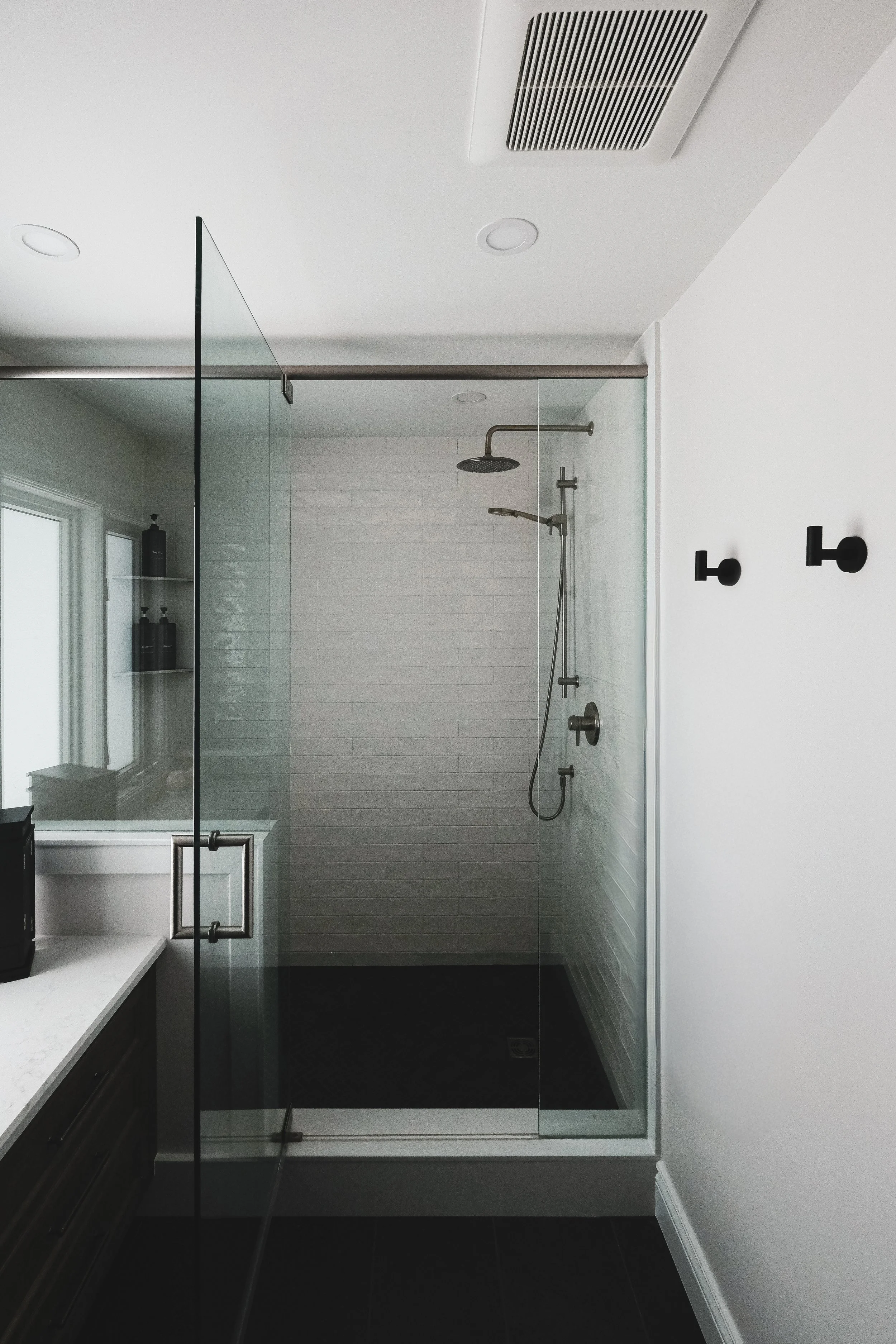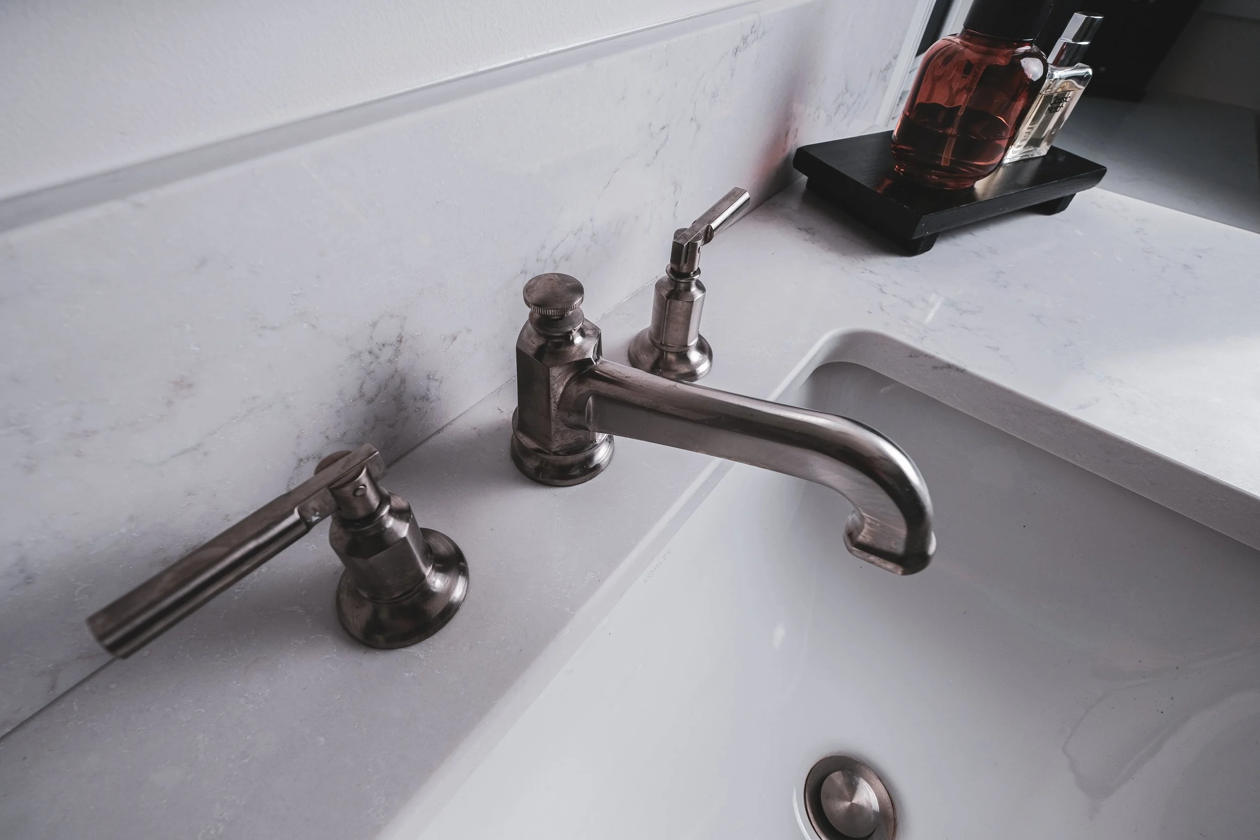 A modern bathroom that pairs clean lines with warm, understated finishes for a balanced and inviting feel. Double vanity, rich wood cabinetry with brushed metal fixtures for a look that feels both refined and practical.
